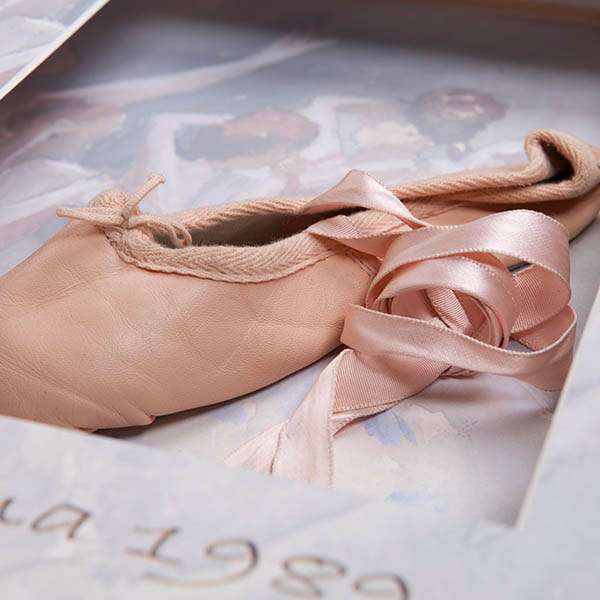 We can create a layout to show several items of memorabilia together, or use a photo mounted directly onto the mount surrounding your treasured items – like the child’s ballerina shoe.